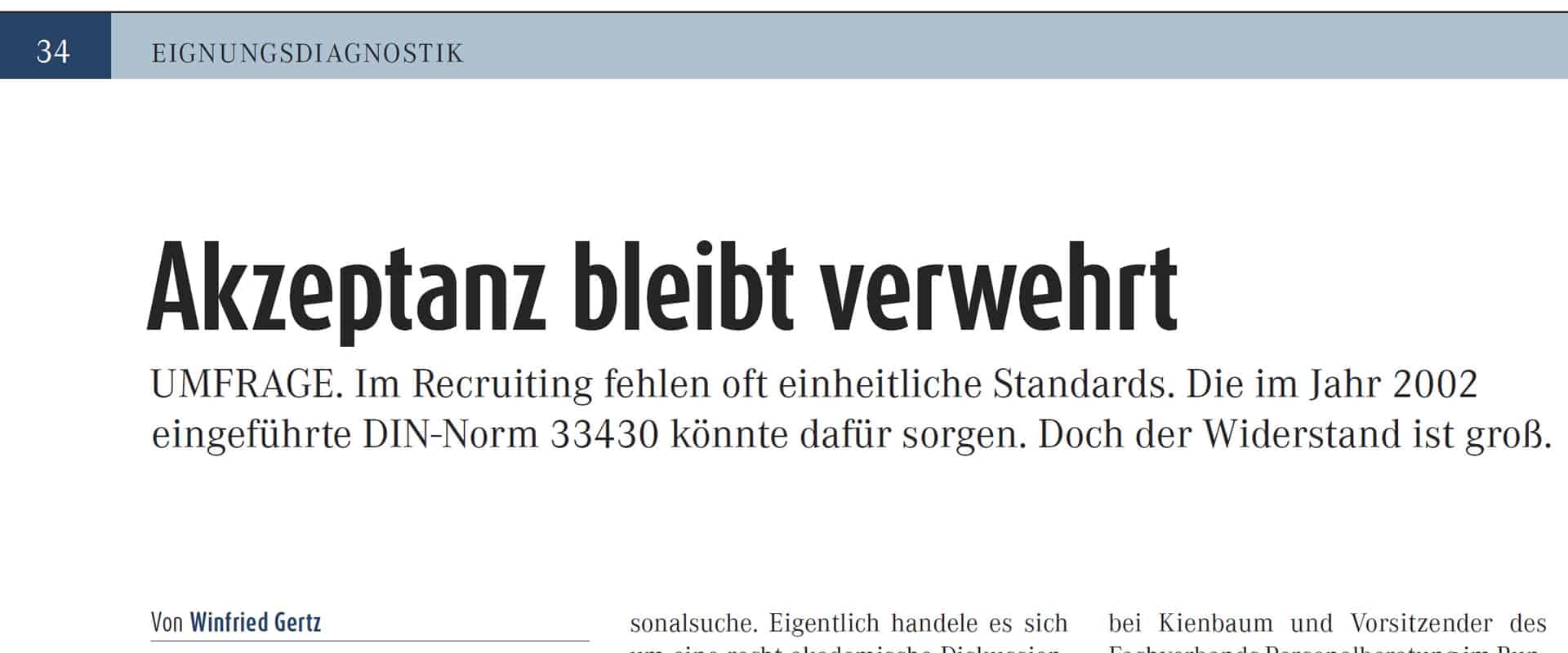 Knapp zehn Jahre gibt es die DIN-Norm 33430. Sie beschreibt die Anforderungen an Verfahren zur berufsbezogenen Eignungsbeurteilung und ist die erste Norm überhaupt, die einen personalwirtschaftlichen Prozess zum Gegenstand hat. Nach rund sechs Jahren Vorarbeit im Februar 2002 vom Arbeitsausschuss „Psychologische Eignungsdiagnostik“ des Deutschen Instituts für Normung verabschiedet und wenige Monate später veröffentlicht, formuliert DIN 33430 Qualitätskriterien für die Auswahl, Planung, Durchführung und Auswertung von berufsbezogenen Eignungsbeurteilungen.